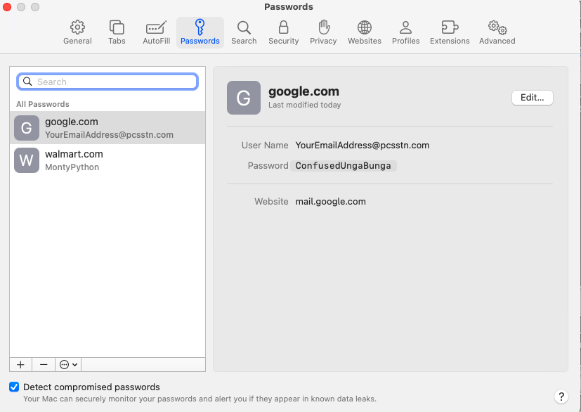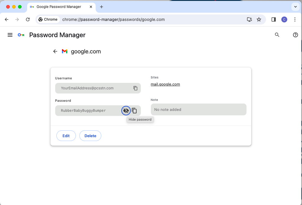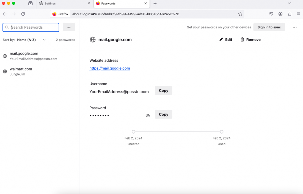 3. Any saved passwords are displayed by web site. In the example below, both Google and Walmart are shown. For this example, I click on Google, since I would like to know the saved password for mail.google.com. You see the username (in this case, YourEmailAddress@pcsstn.com), but the password is obscured by dots.